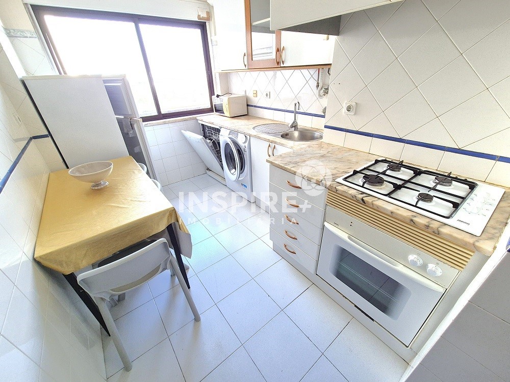 Descubra este apartamento com uma sala ampla de 20 m², o chão em mosaico proporciona um ambiente acolhedor e fácil de manter. A cozinha de 10 m², totalmente equipada, conta com uma bancada em mármore e móveis lacados a branco, além de uma despensa que garante espaço extra para armazenamento.